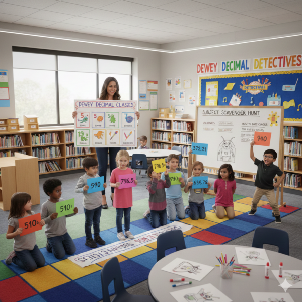 - Task: Give students index cards with various Dewey Decimal call numbers (e.g., 510, 599, 796.5, 372.21, 940) and have them physically line up in the correct shelf order.